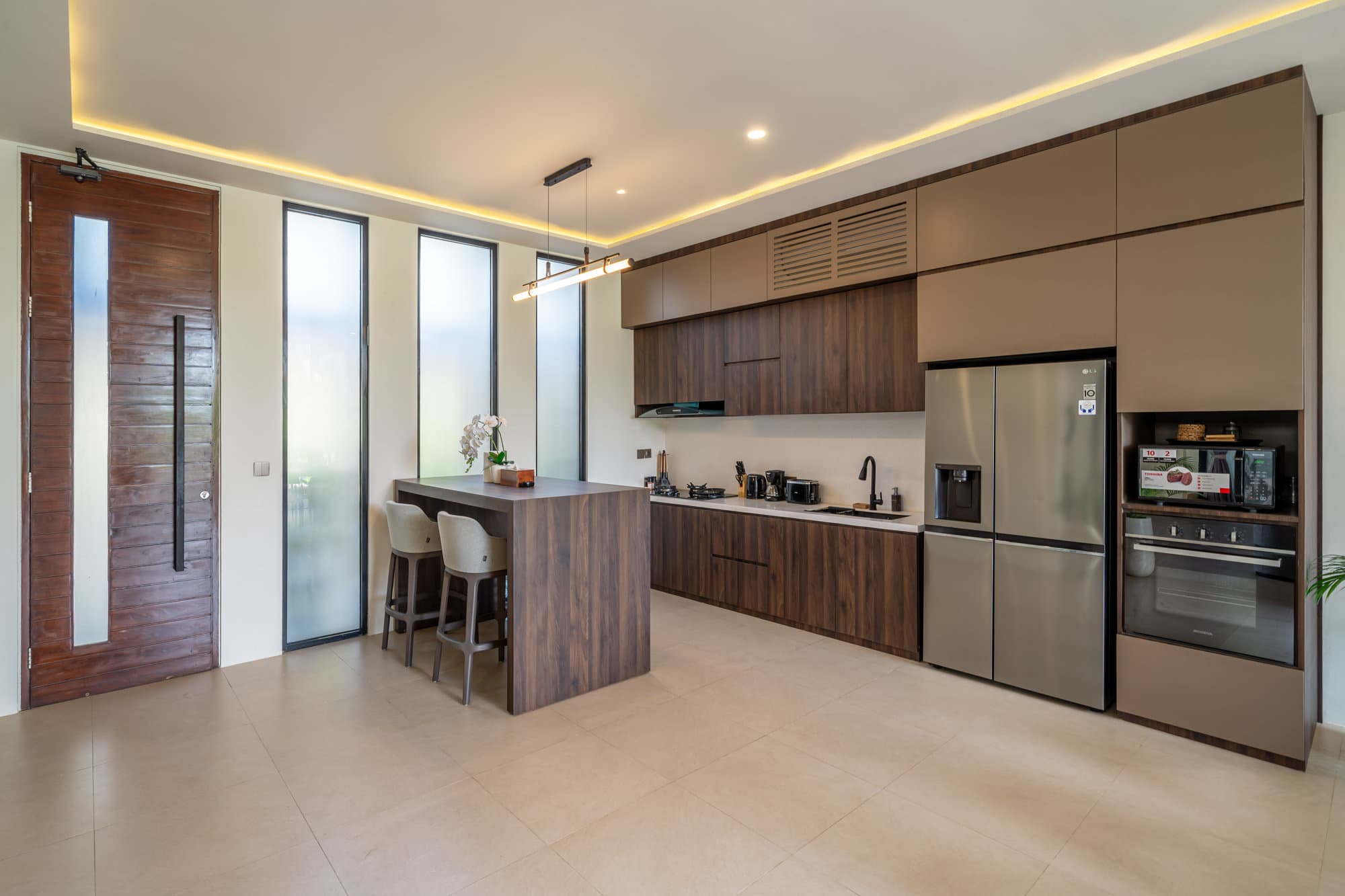 Once you book, the entire villa will become your personal sanctuary. Enjoy the elegance of our cozy living room, a chic and inviting space designed for relaxing and socializing. The open kitchen seamlessly connects to the living room, creating a seamless flow that’s perfect for entertaining or casual dining.