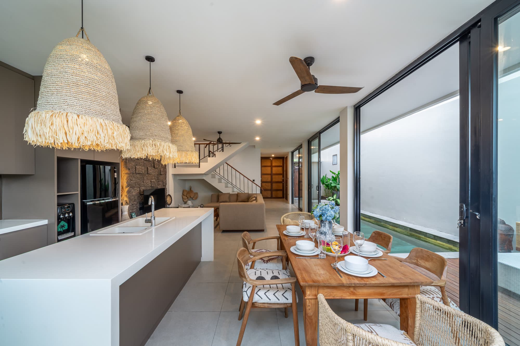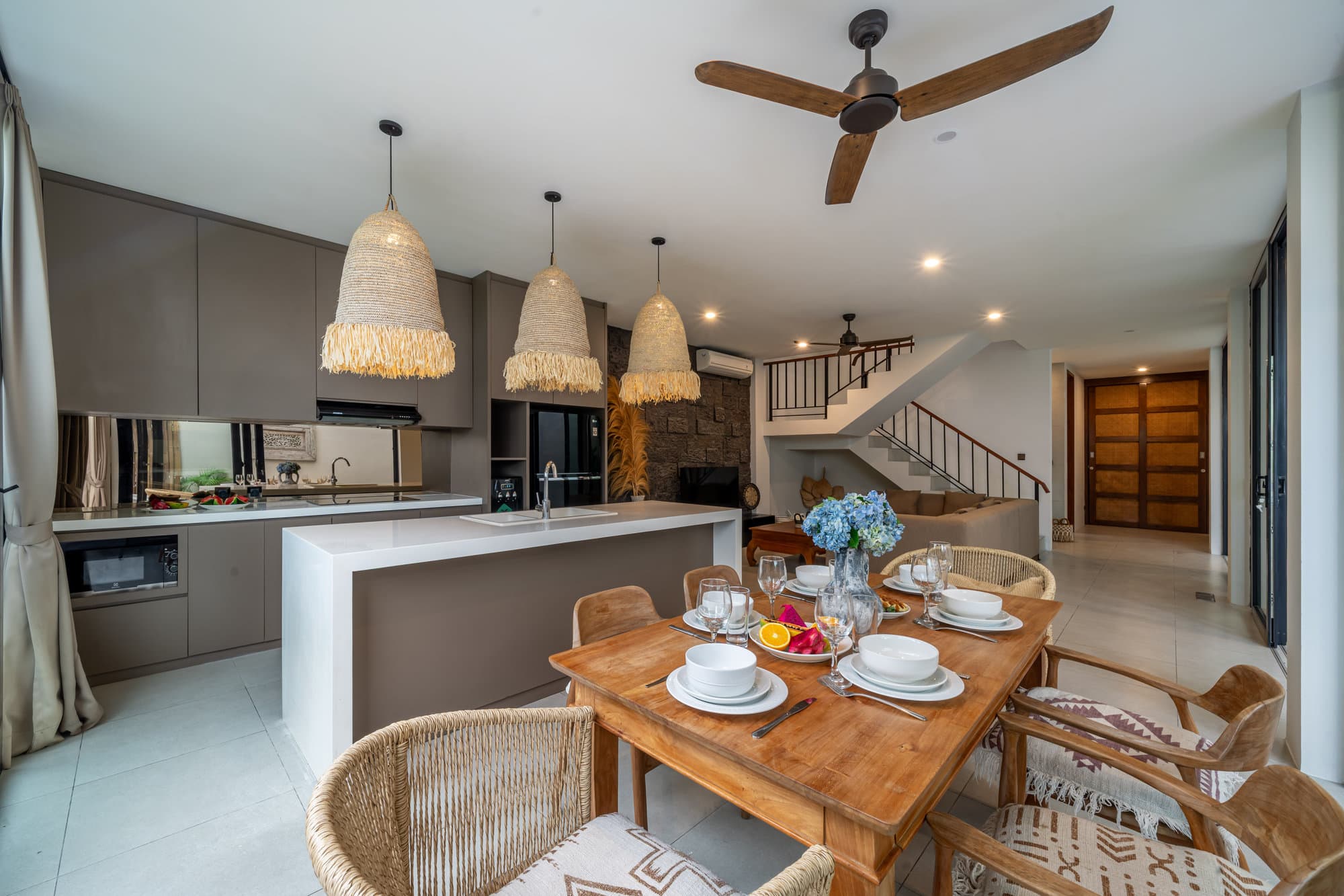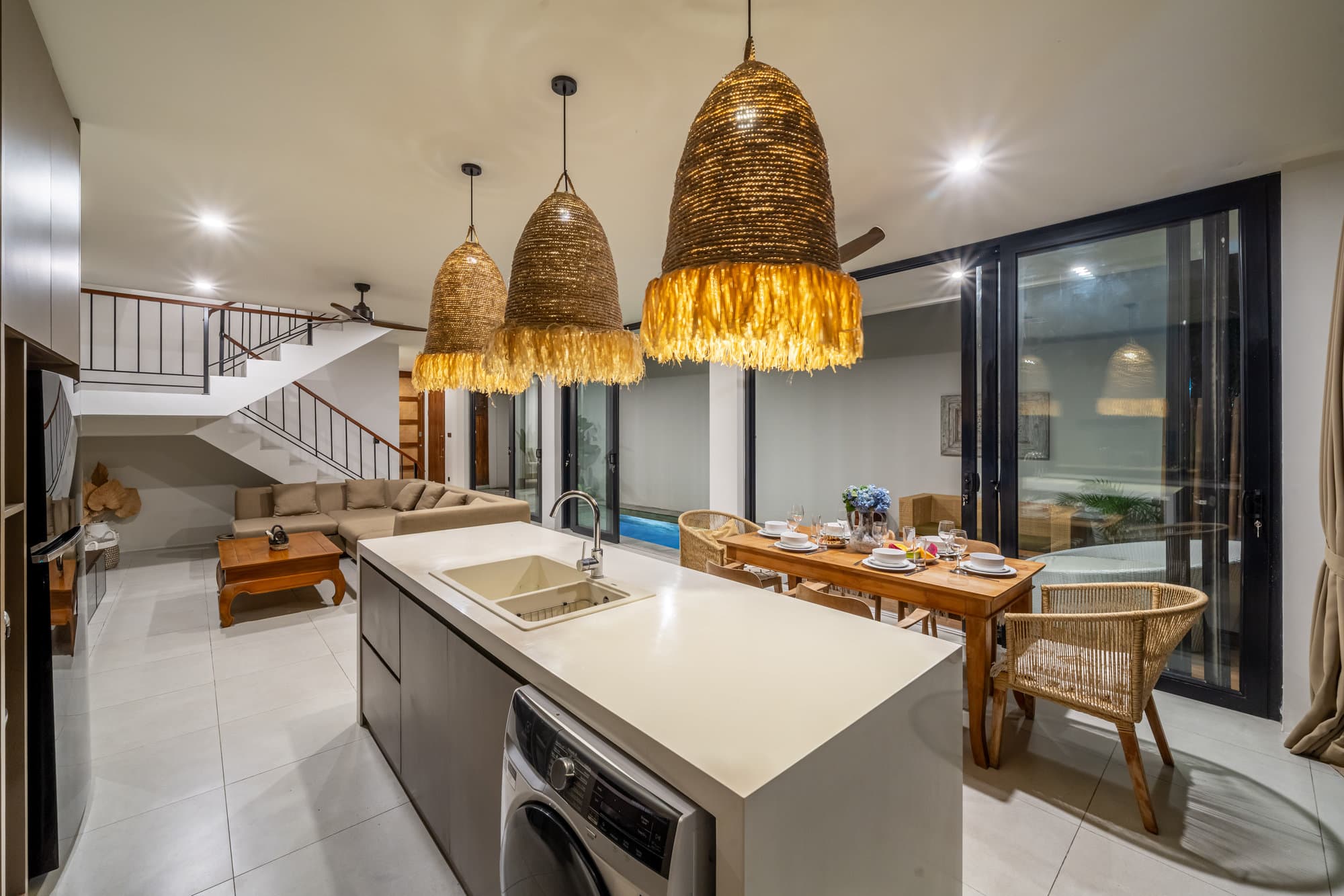 Once you book, the entire villa becomes your own private sanctuary. Enjoy the elegance of our cozy living room, a chic and cozy space designed for relaxing and socializing. The open kitchen seamlessly connects to the living room, creating a seamless flow, perfect for entertaining or informal dining.