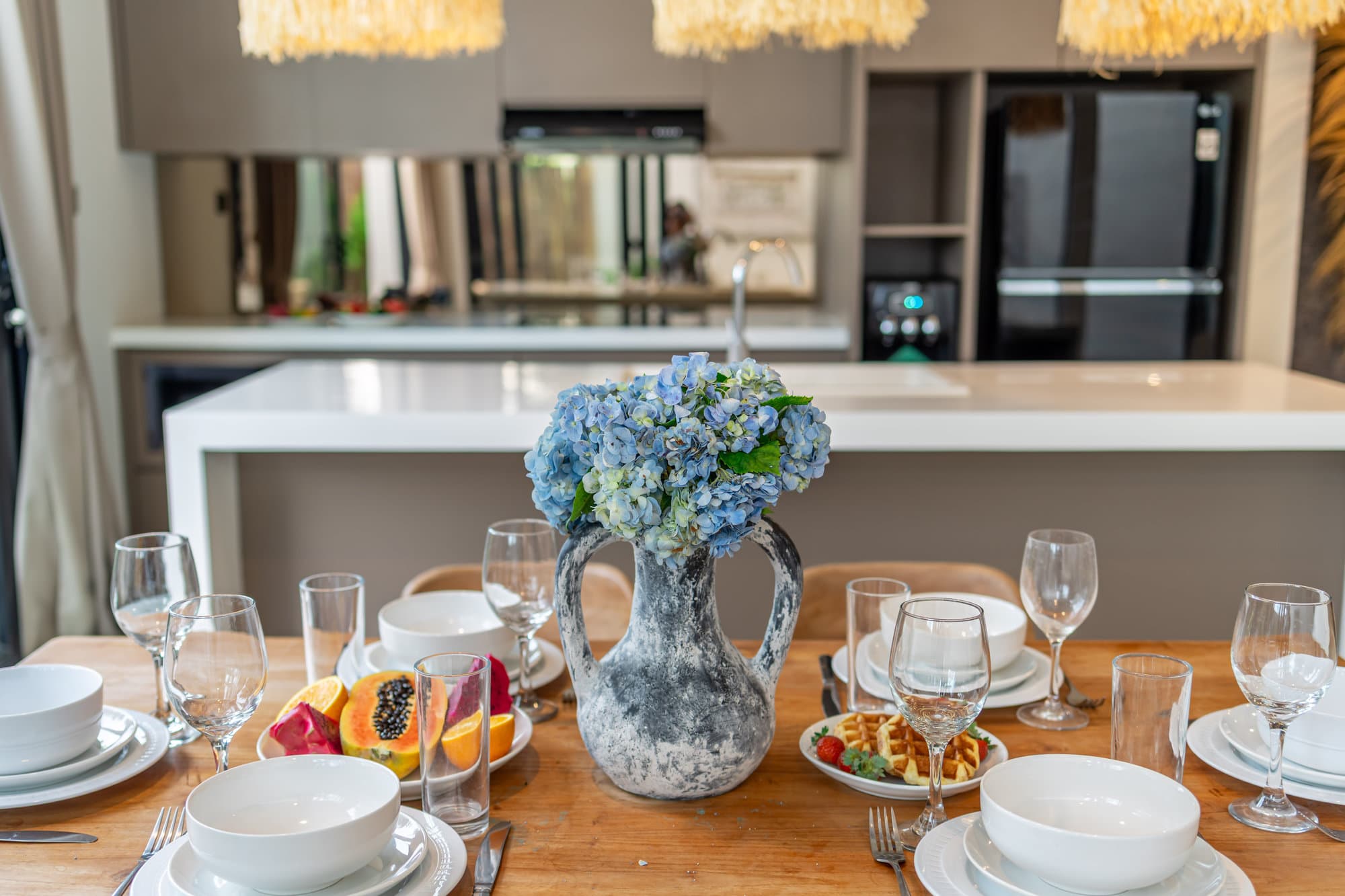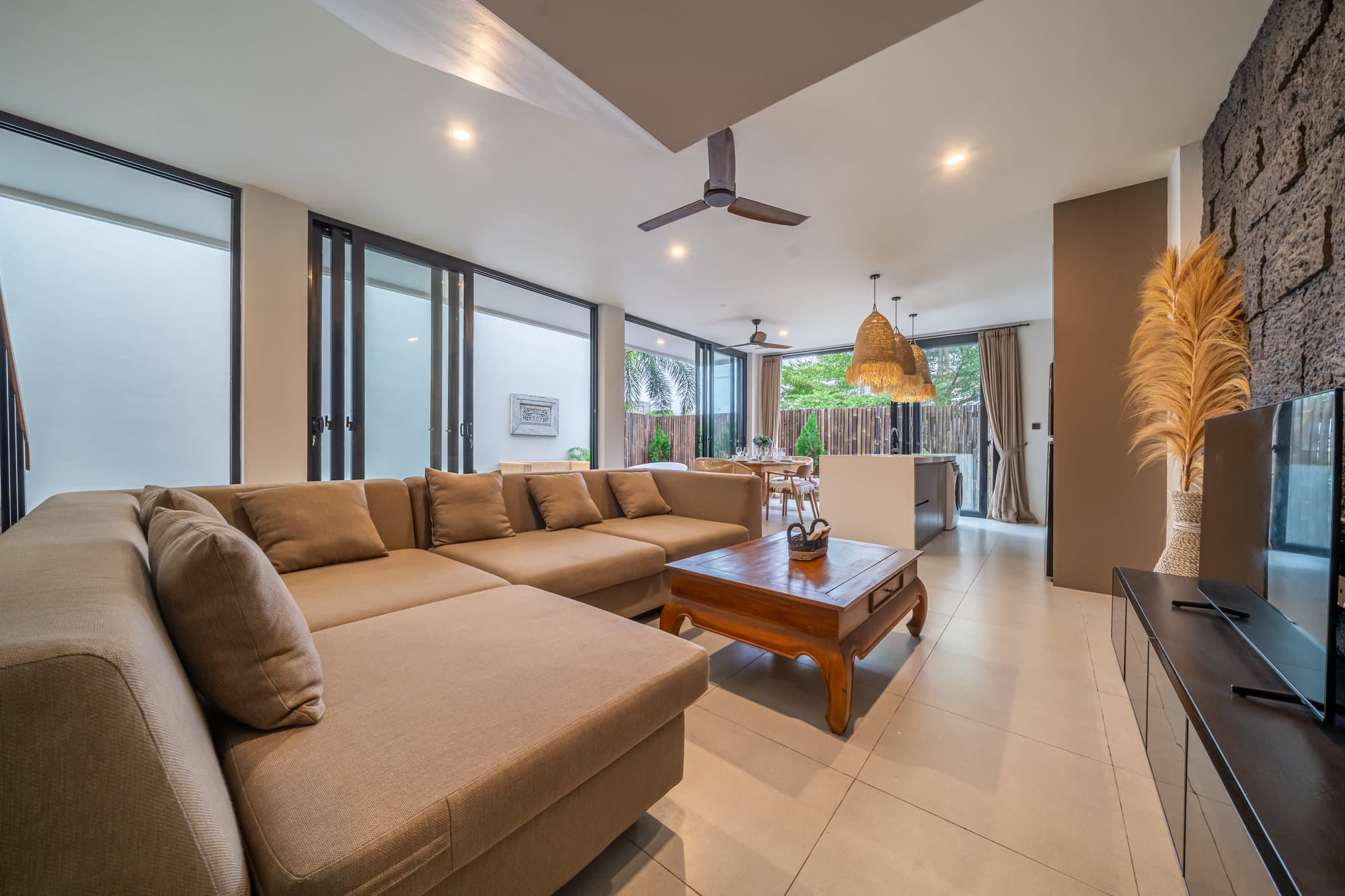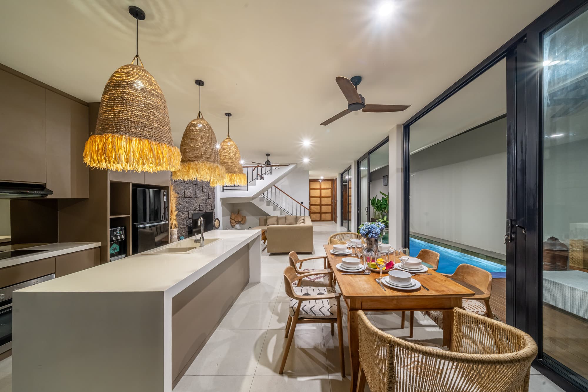 Once you book, the entire villa becomes your own private sanctuary. Enjoy the elegance of our cozy living room, a chic and cozy space designed for relaxing and socializing. The open kitchen seamlessly connects to the living room, creating a seamless flow, perfect for entertaining or informal dining.