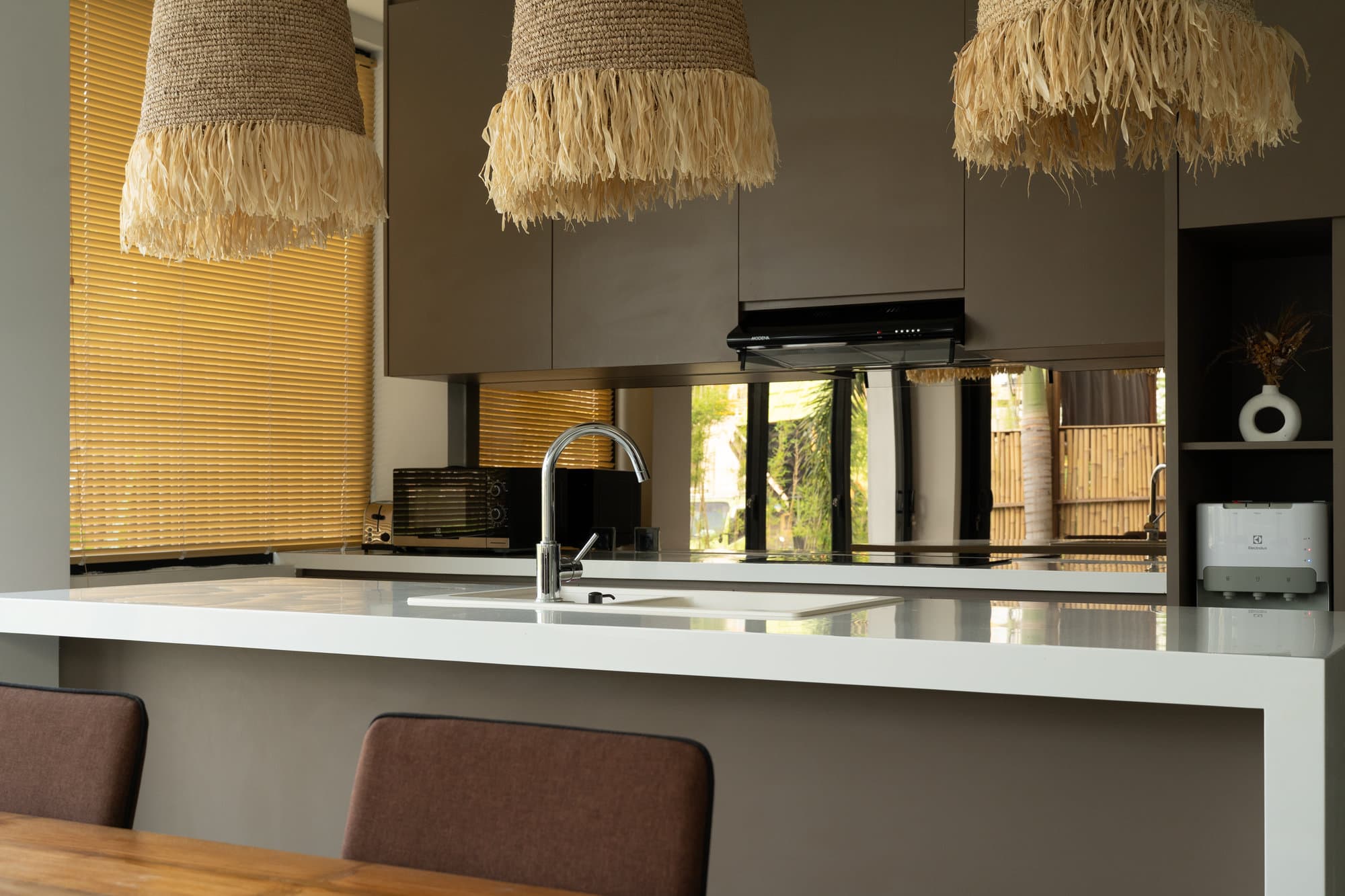 Once you book, the entire villa becomes your own private sanctuary. Enjoy the elegance of our cozy living room, a chic and cozy space designed for relaxing and socializing. The open kitchen seamlessly connects to the living room, creating a seamless flow, perfect for entertaining or informal dining.