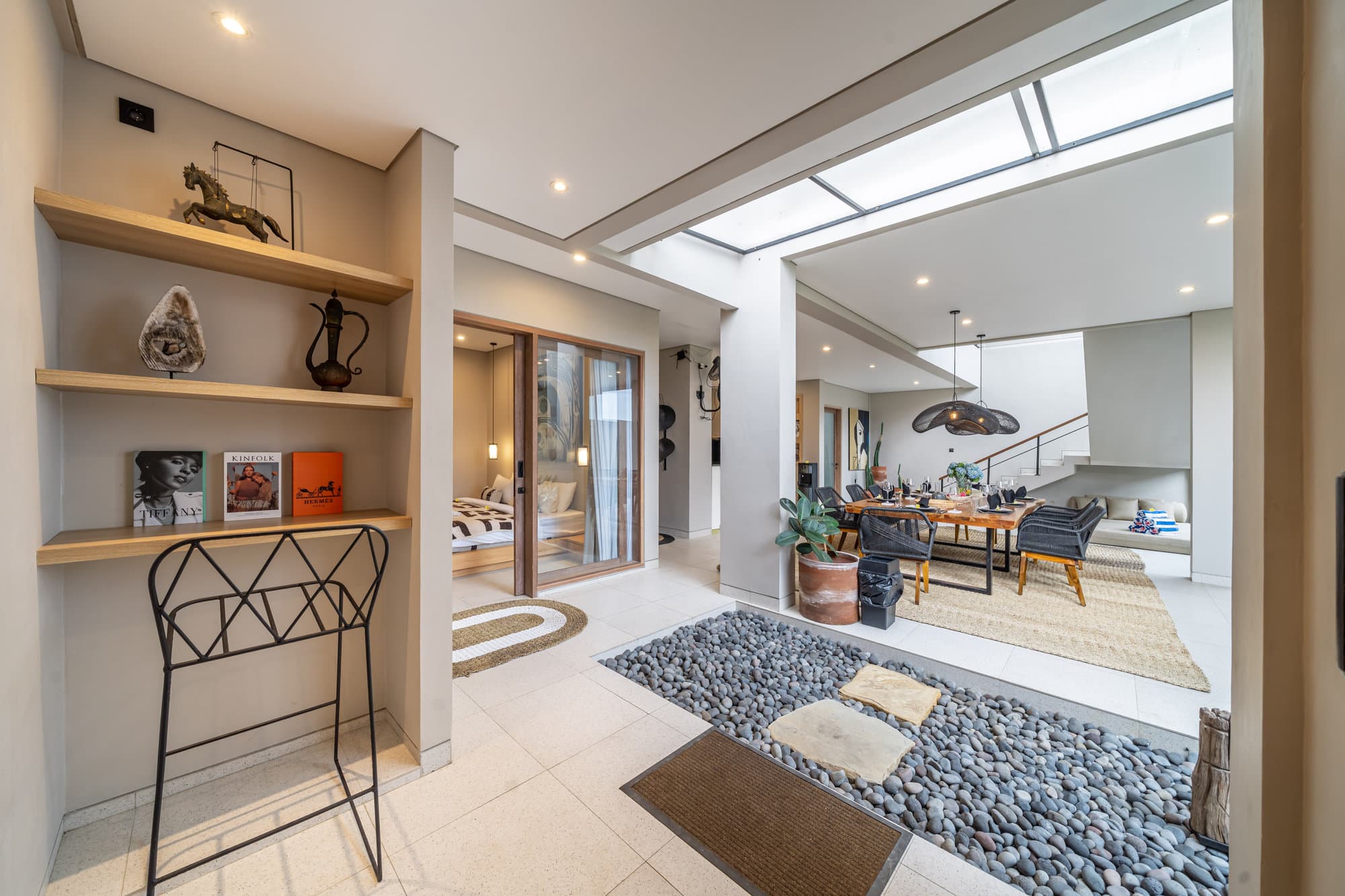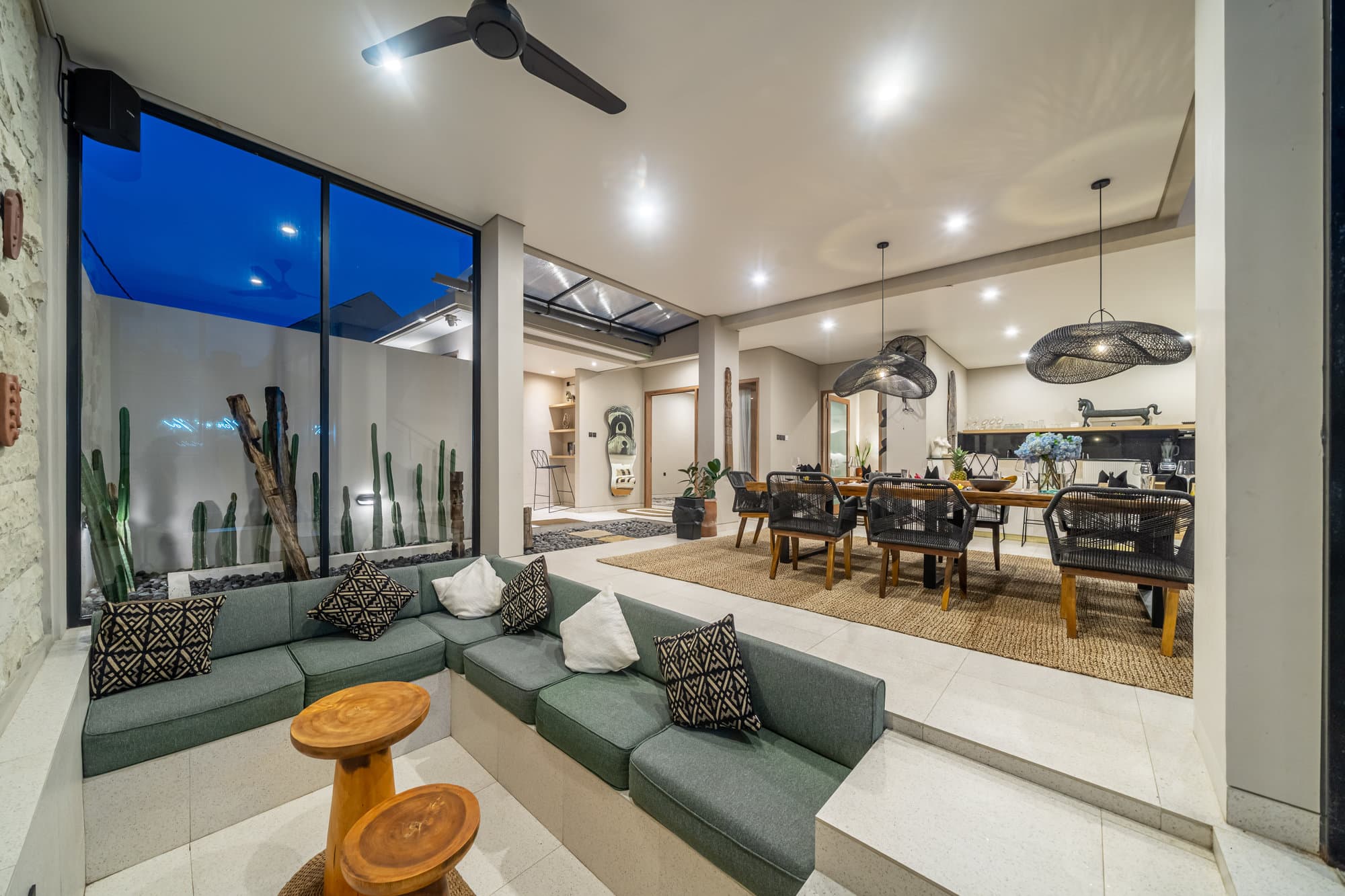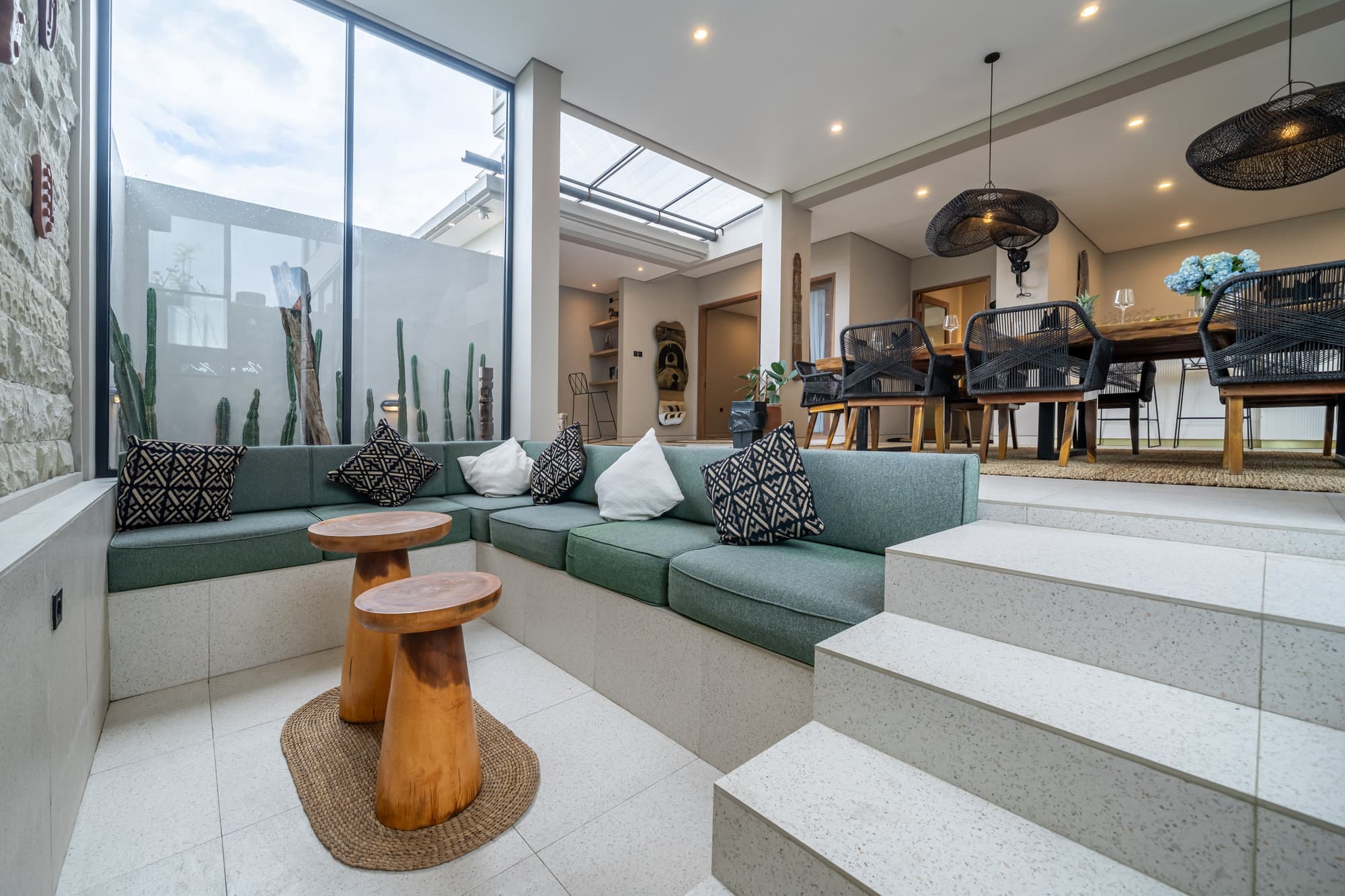Once you book, the entire villa becomes your own private sanctuary. Enjoy the elegance of our cozy living room, a chic and inviting space designed for relaxing and socializing. The open kitchen seamlessly connects to the living room, creating a seamless flow, perfect for entertaining or informal dining.