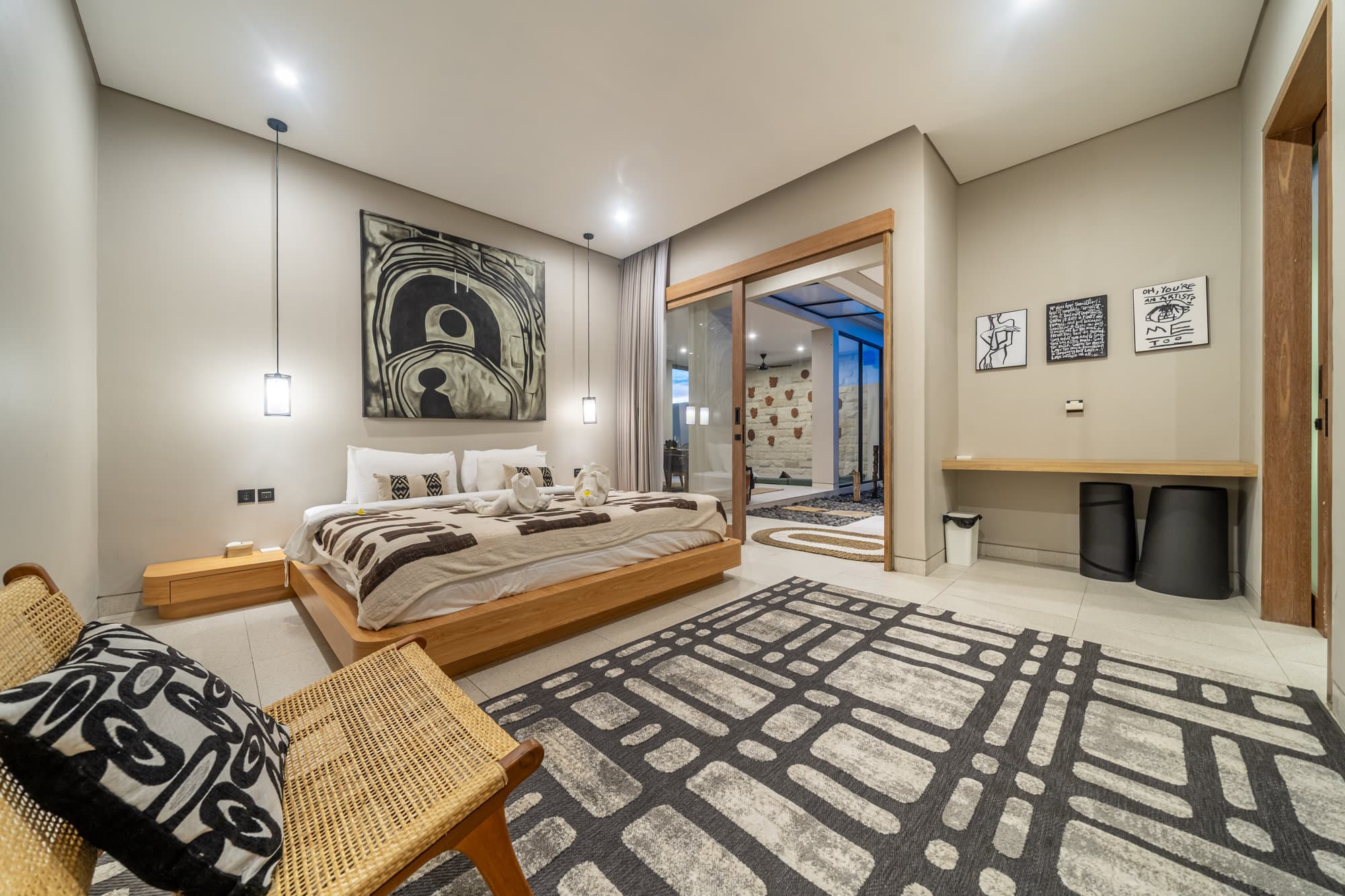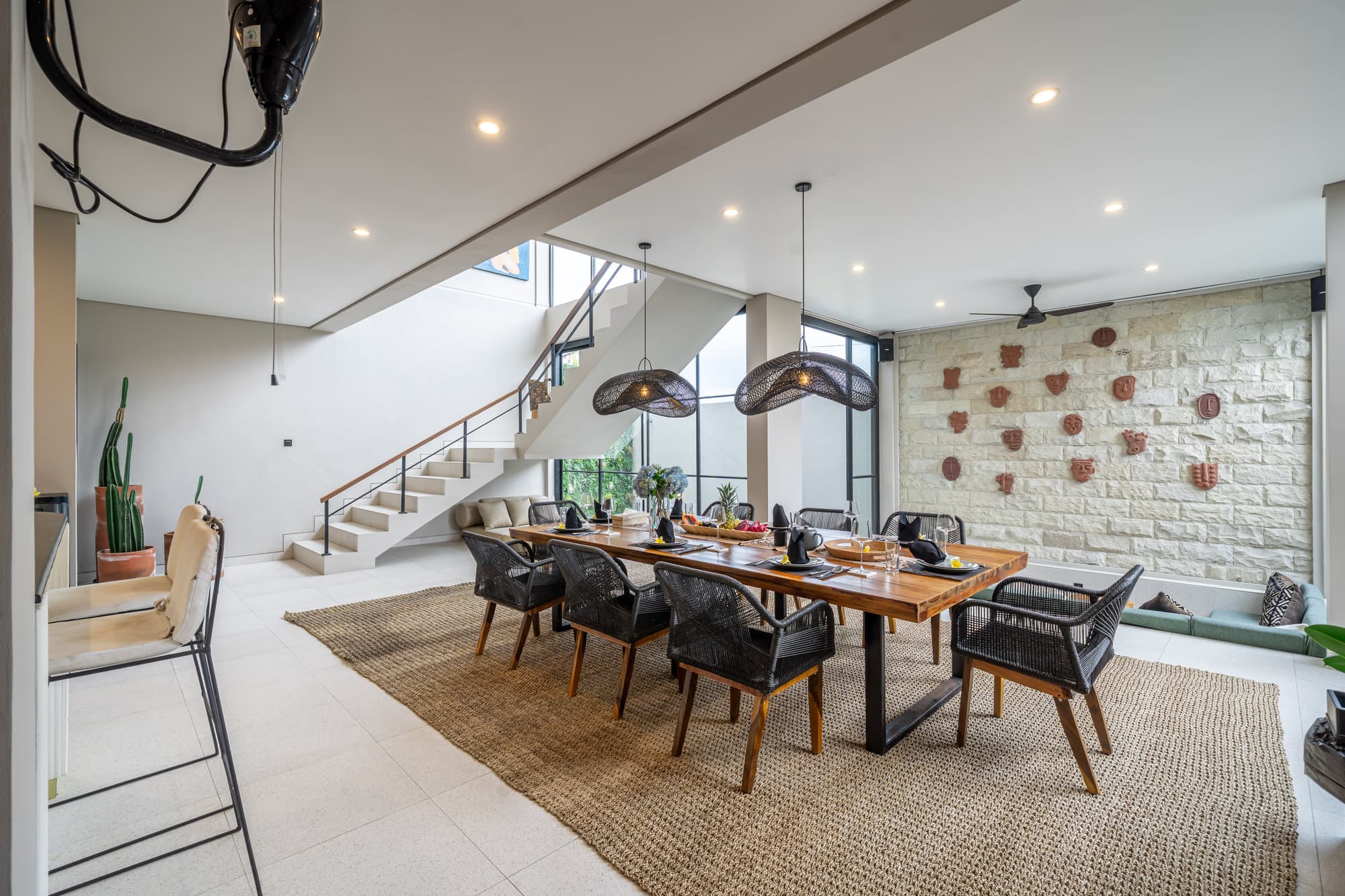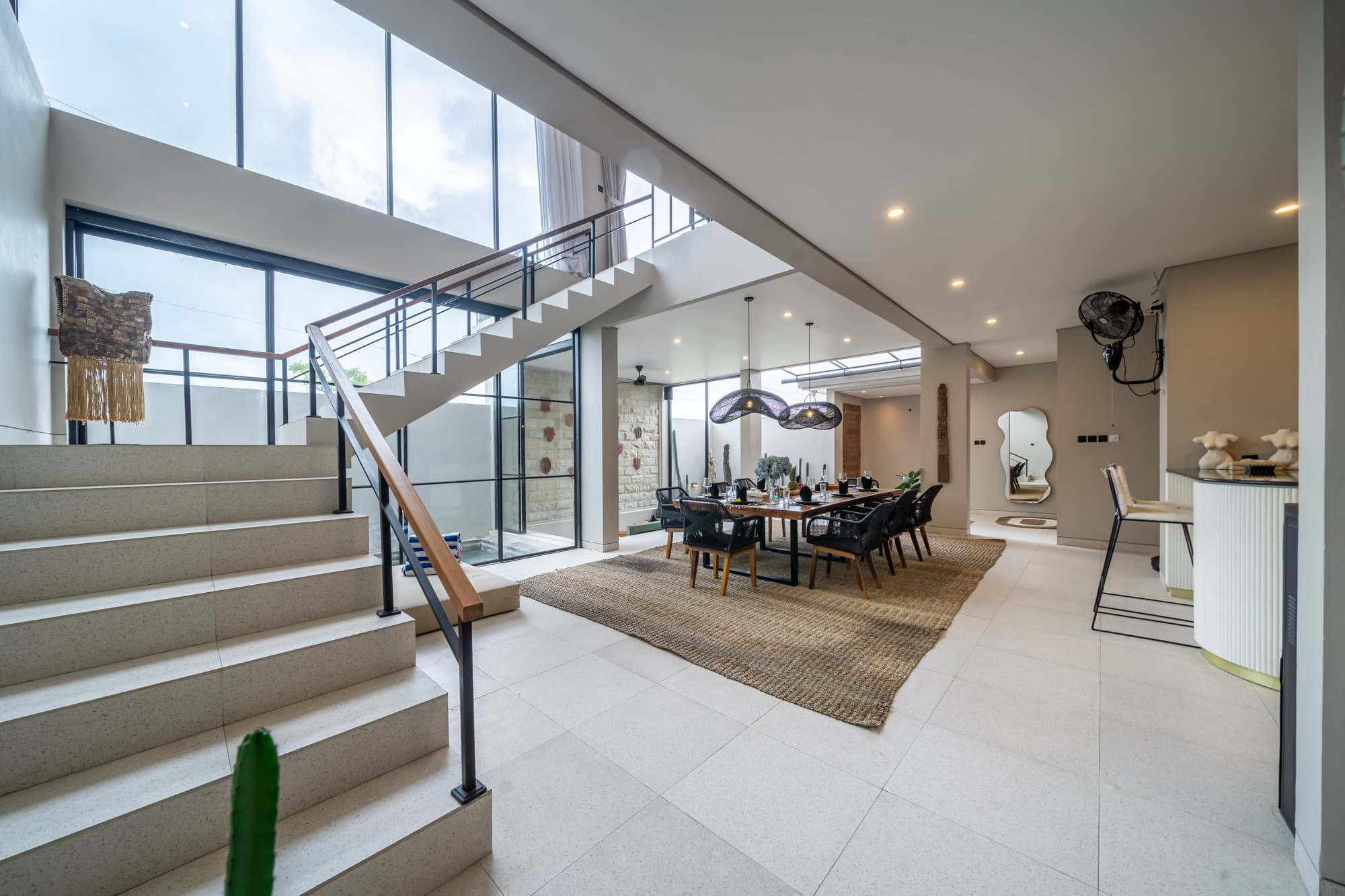 Once you book, the entire villa becomes your own private sanctuary. Enjoy the elegance of our cozy living room, a chic and inviting space designed for relaxing and socializing. The open kitchen seamlessly connects to the living room, creating a seamless flow, perfect for entertaining or informal dining.