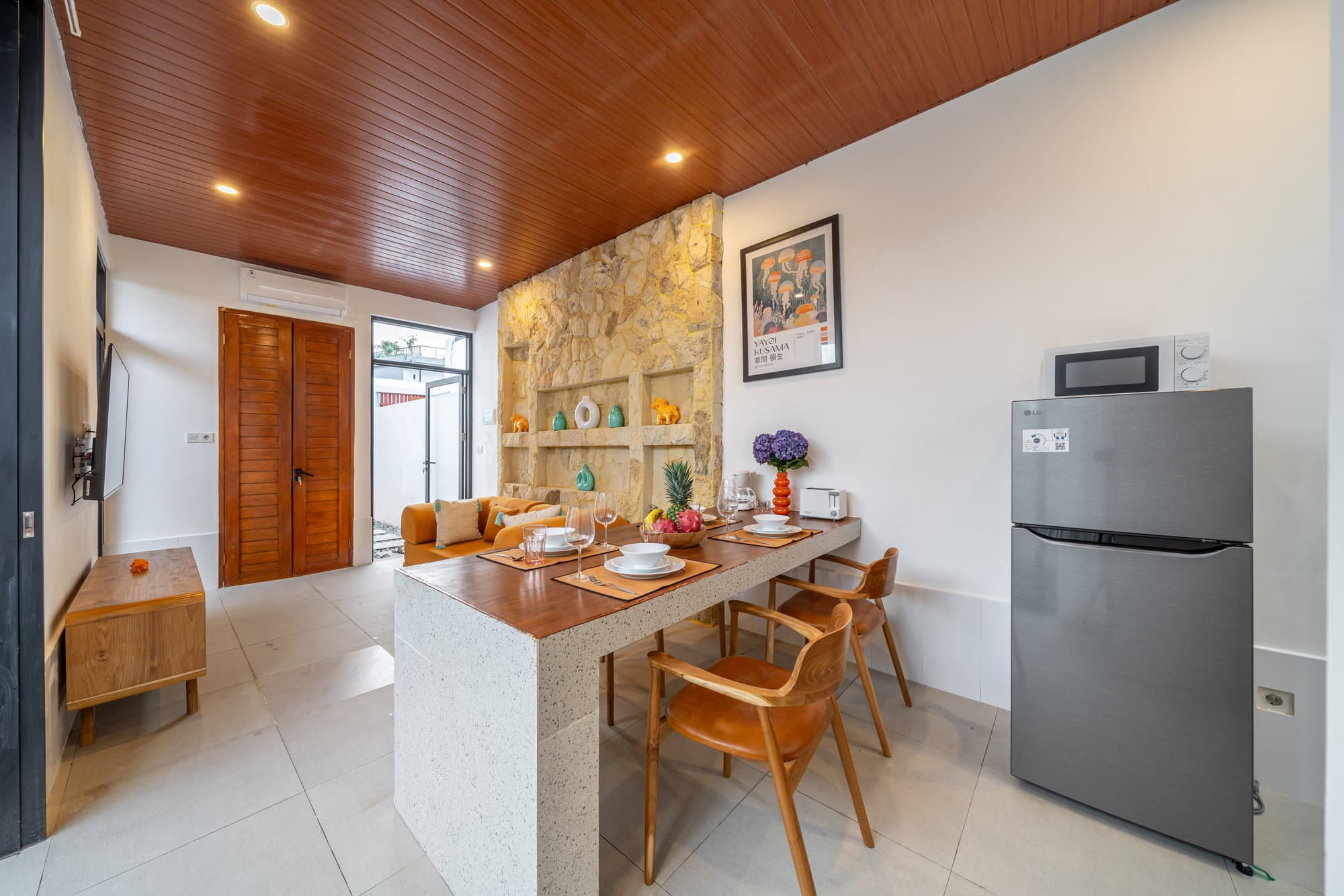 Once you book, the entire property is at your disposal. You will have access to our beautiful living room – simple and stylish. The kitchen is seamlessly integrated with the living room, creating a comfortable and social atmosphere. Each room is air-conditioned and has its own view of the green garden, ensuring a comfortable and unforgettable stay with us.