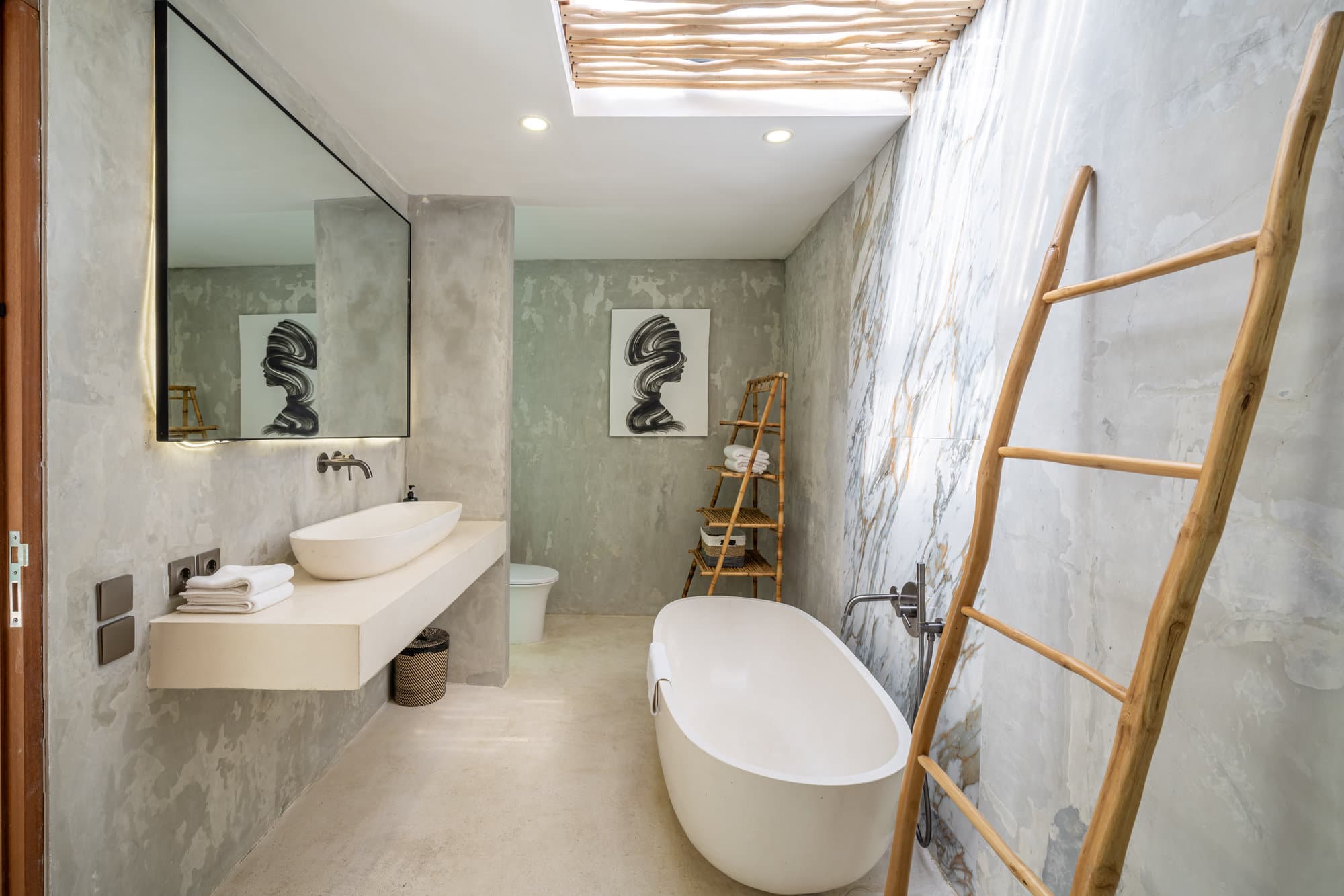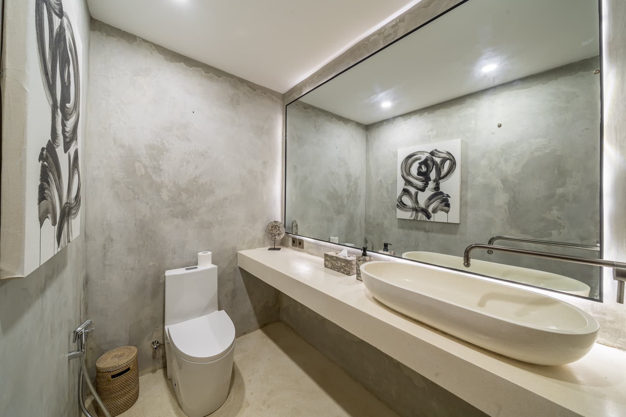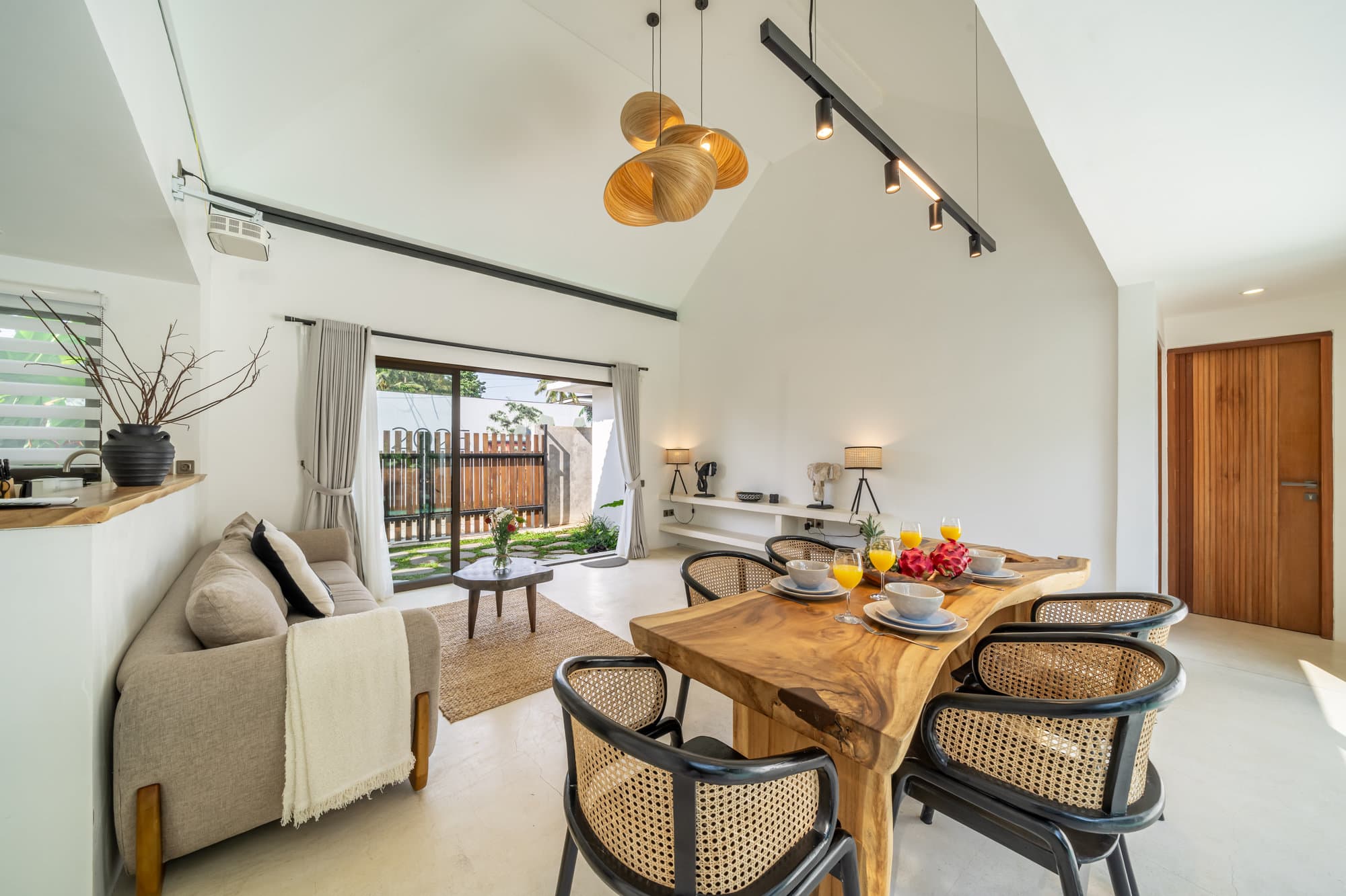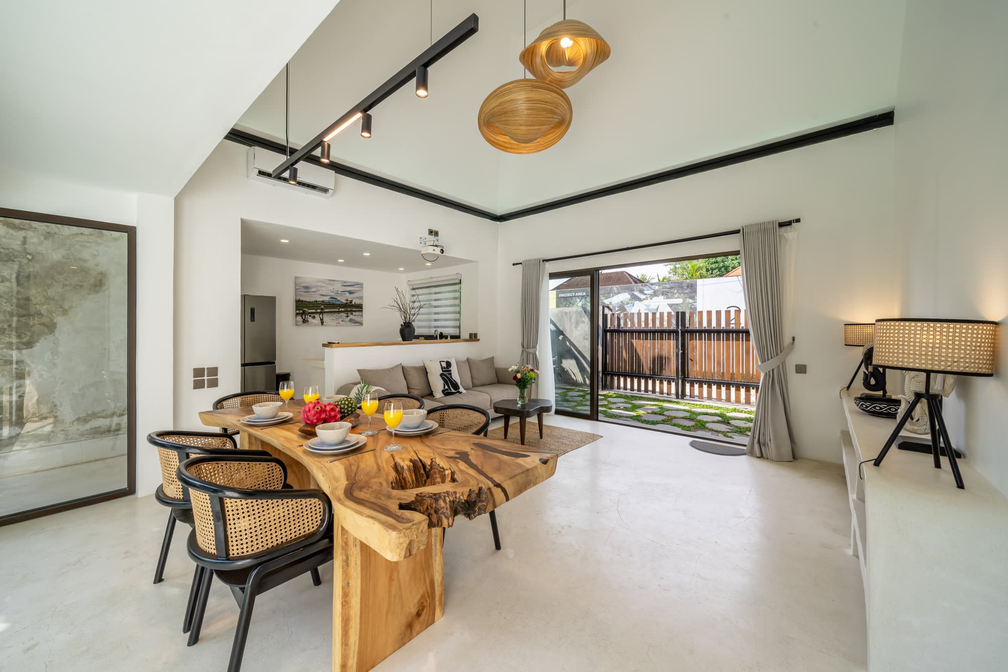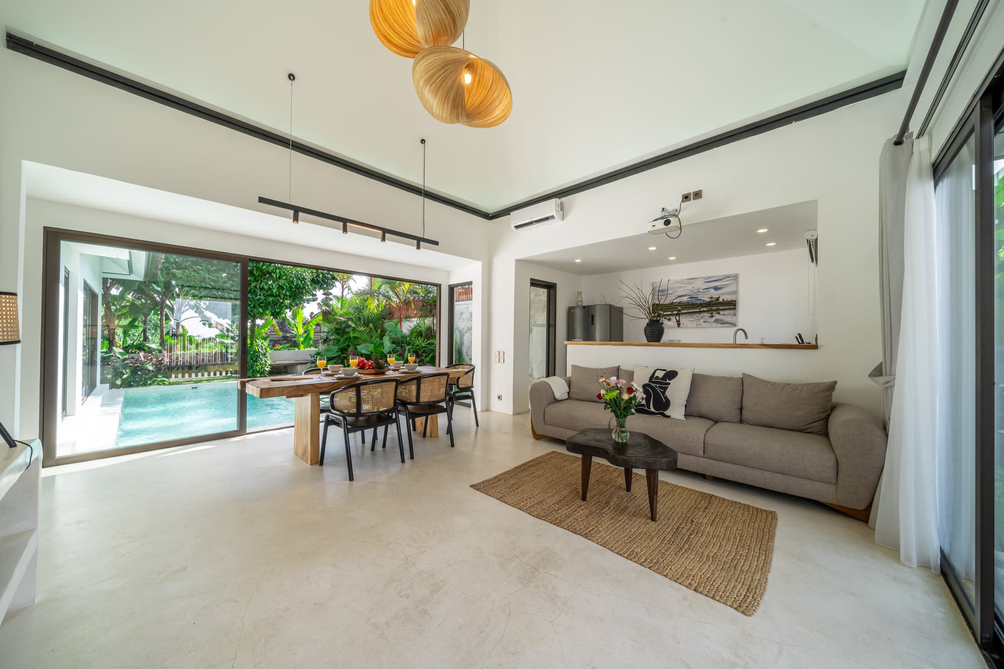 Once you book, the entire villa becomes your own private sanctuary. Enjoy the elegance of our cozy living room, a chic and cozy space designed for relaxing and socializing. The open kitchen seamlessly connects to the living room, creating a seamless flow, perfect for entertaining or informal dining.