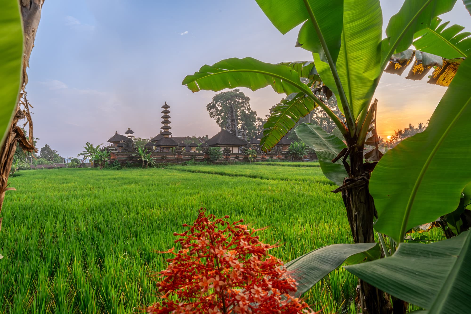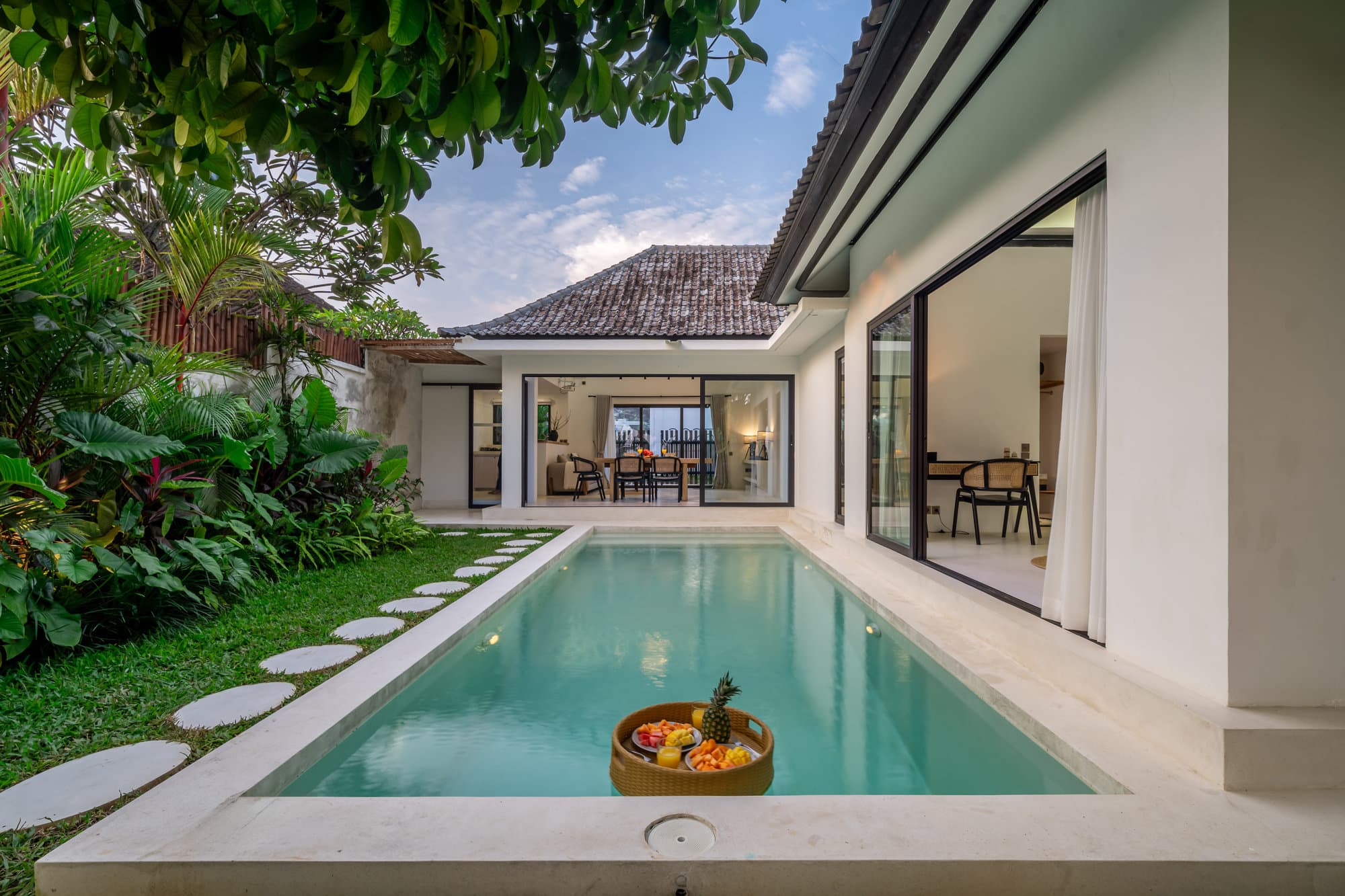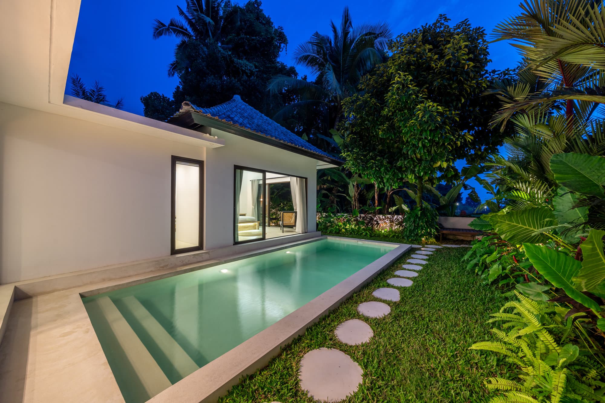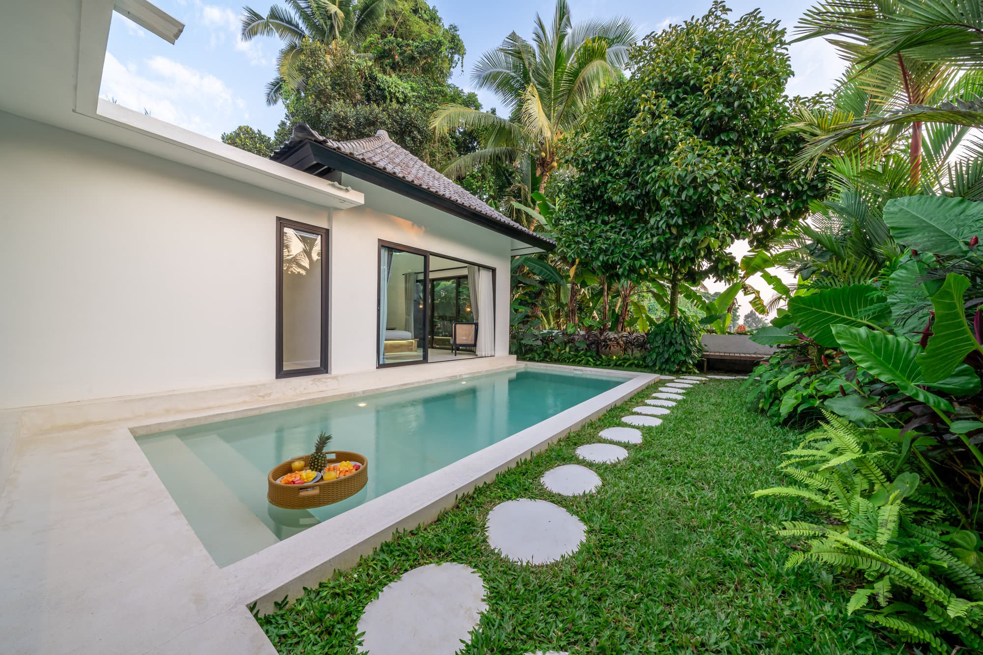 Welcome to Niki Villa Ubud in Bali – a new and stylish villa with 2 bedrooms, a modern kitchen, a swimming pool with stunning views of the rice fields and temple, and a bright living room with a home theater and a projector!