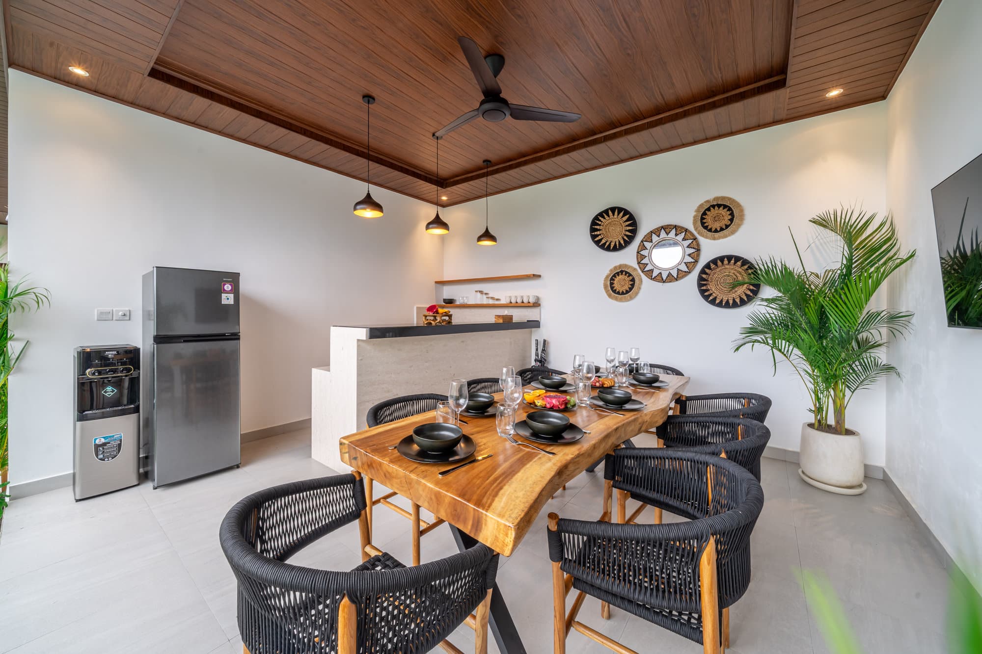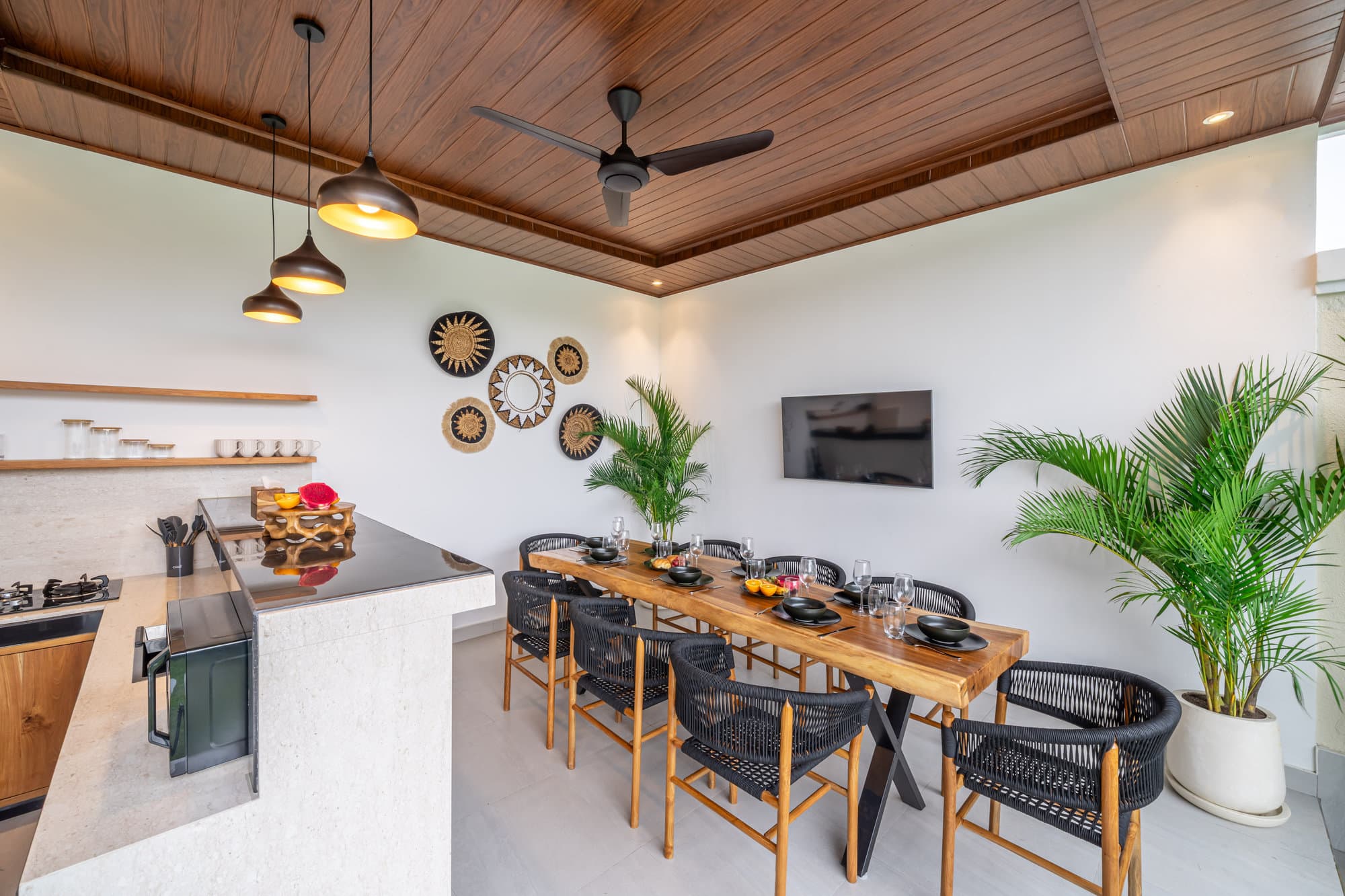 Once you book, the entire villa becomes your own private sanctuary. Enjoy the elegance of our cozy living room, a chic and cozy space designed for relaxing and socializing. The open kitchen seamlessly connects to the living room, creating a seamless flow, perfect for entertaining or informal dining.