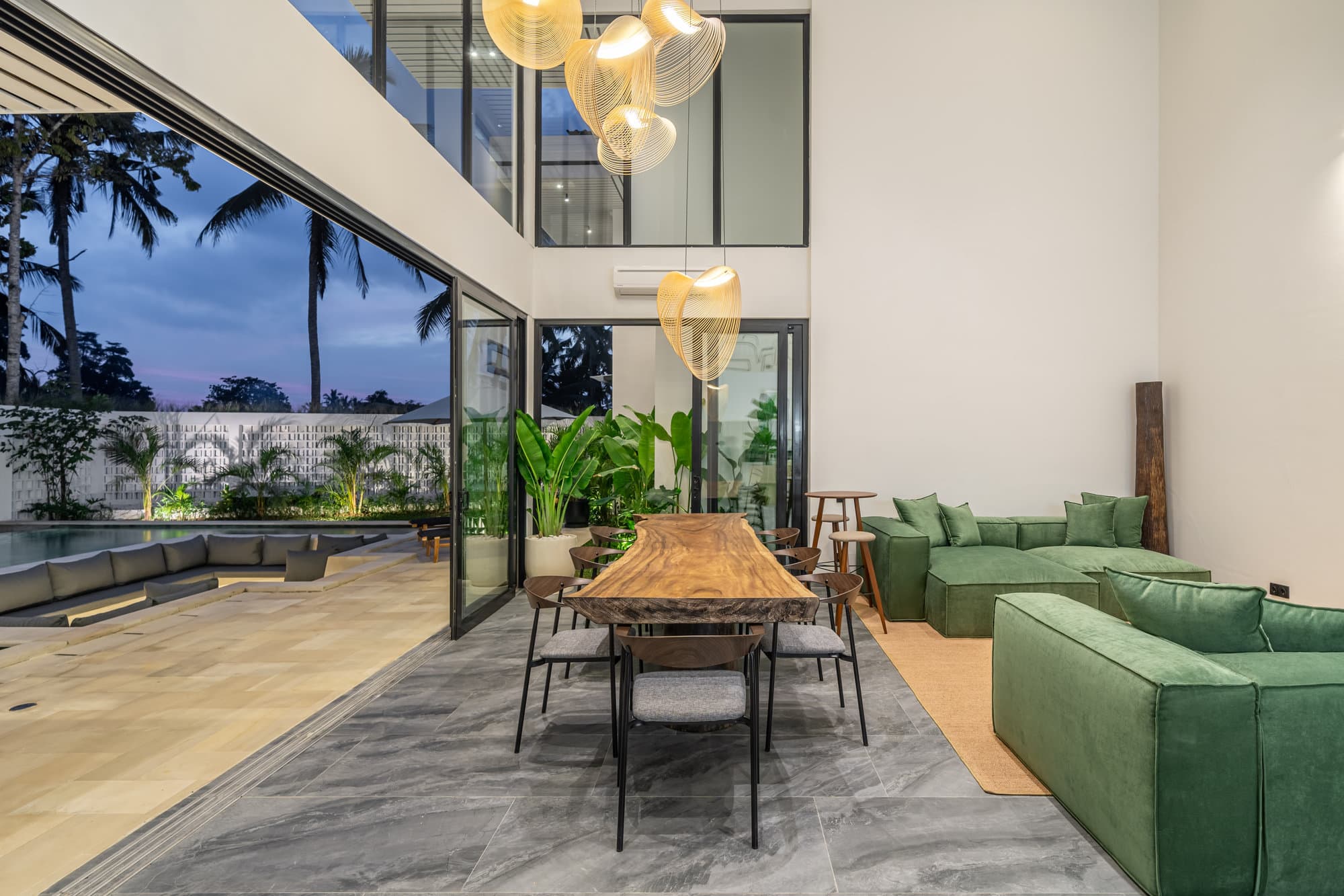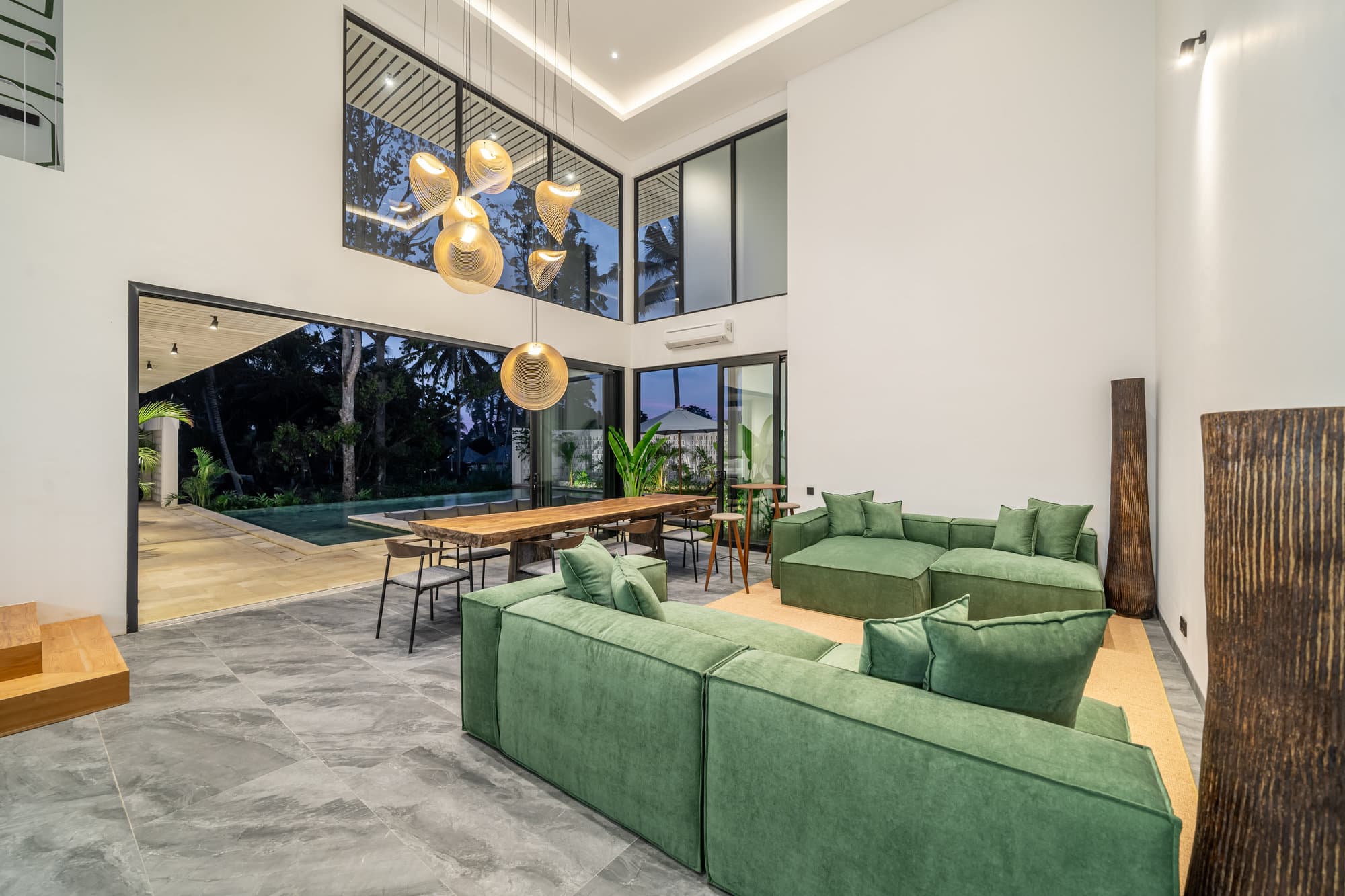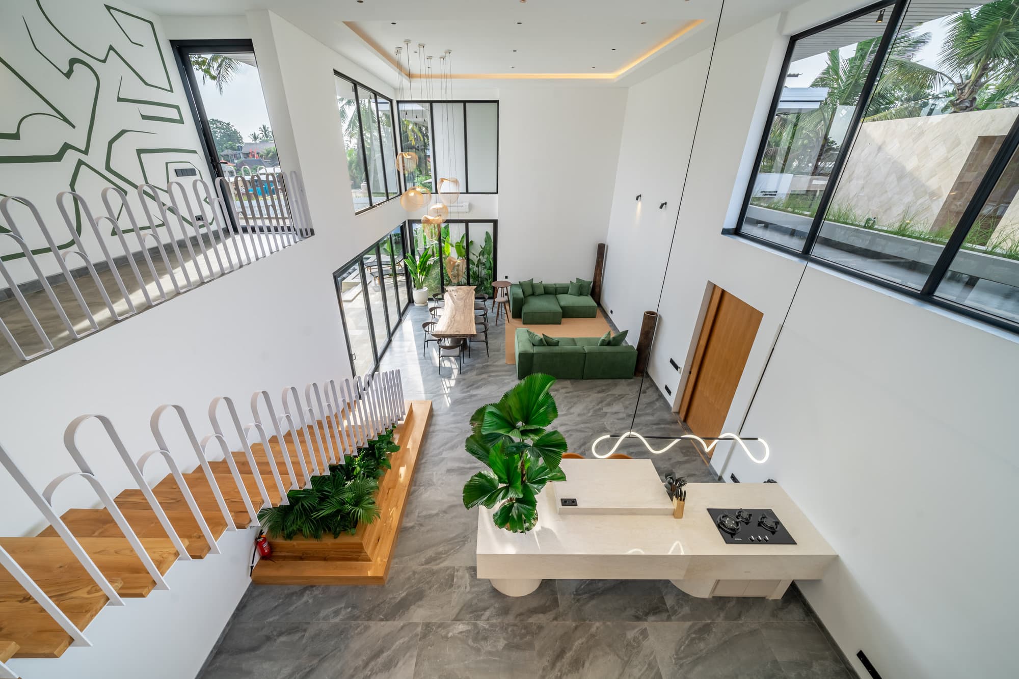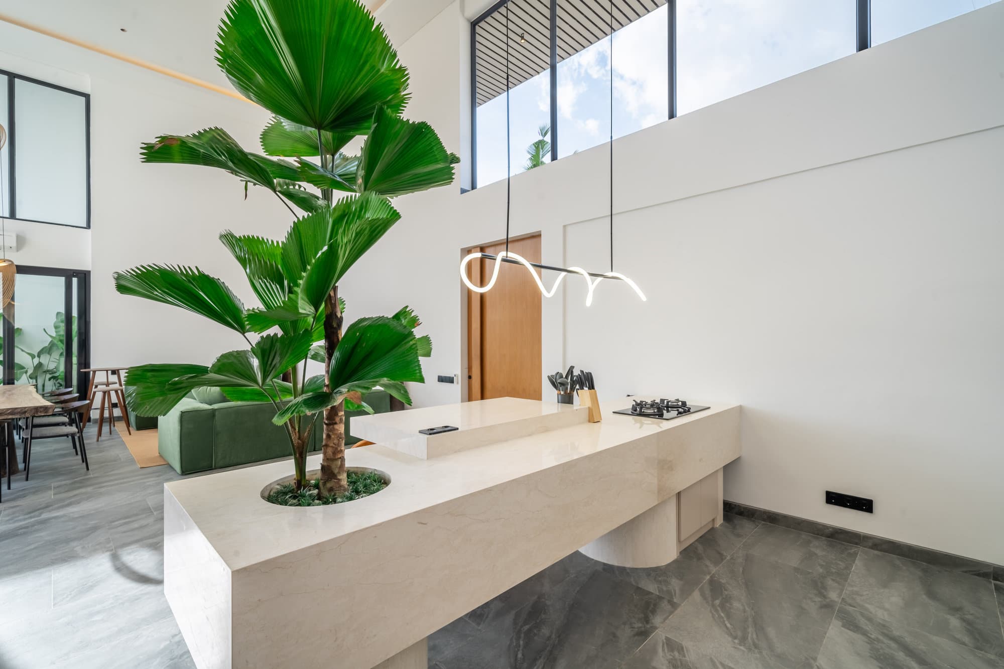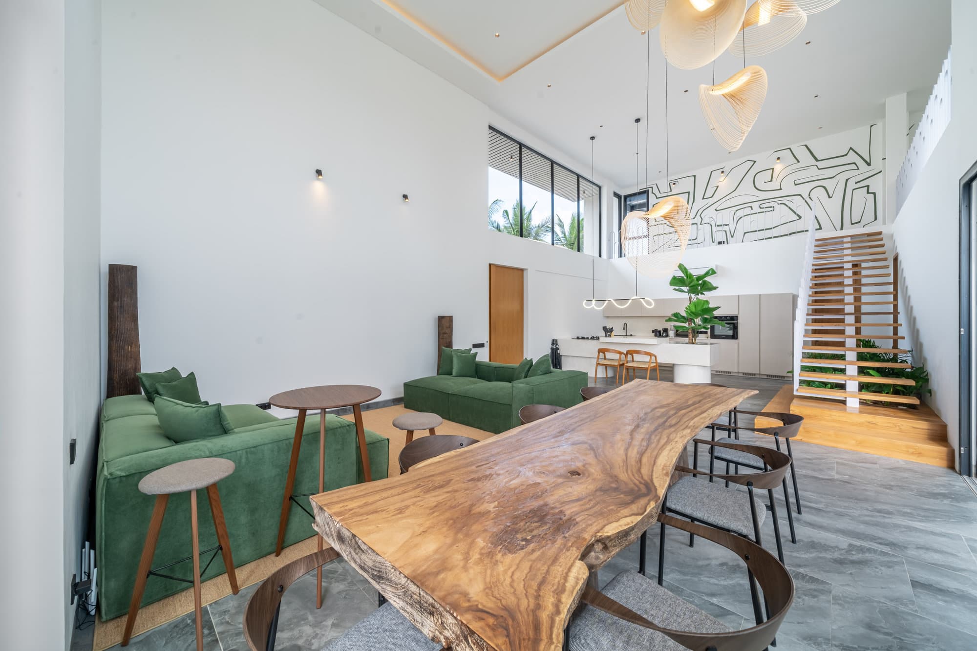 Once you book, the entire villa becomes your private sanctuary. Enjoy the elegance of our cozy living room, a chic and cozy space designed for relaxing and socializing. The open kitchen seamlessly connects to the living room, creating a seamless flow, perfect for entertaining or informal dining.