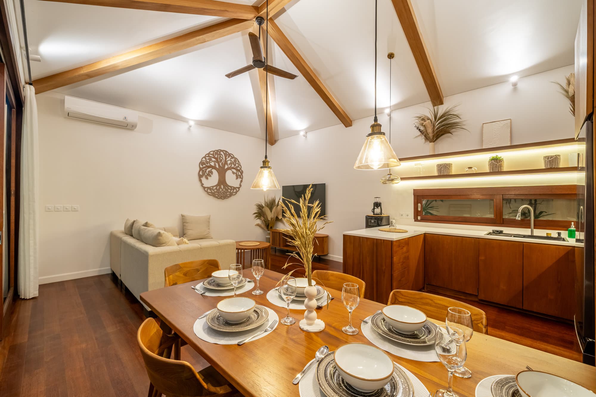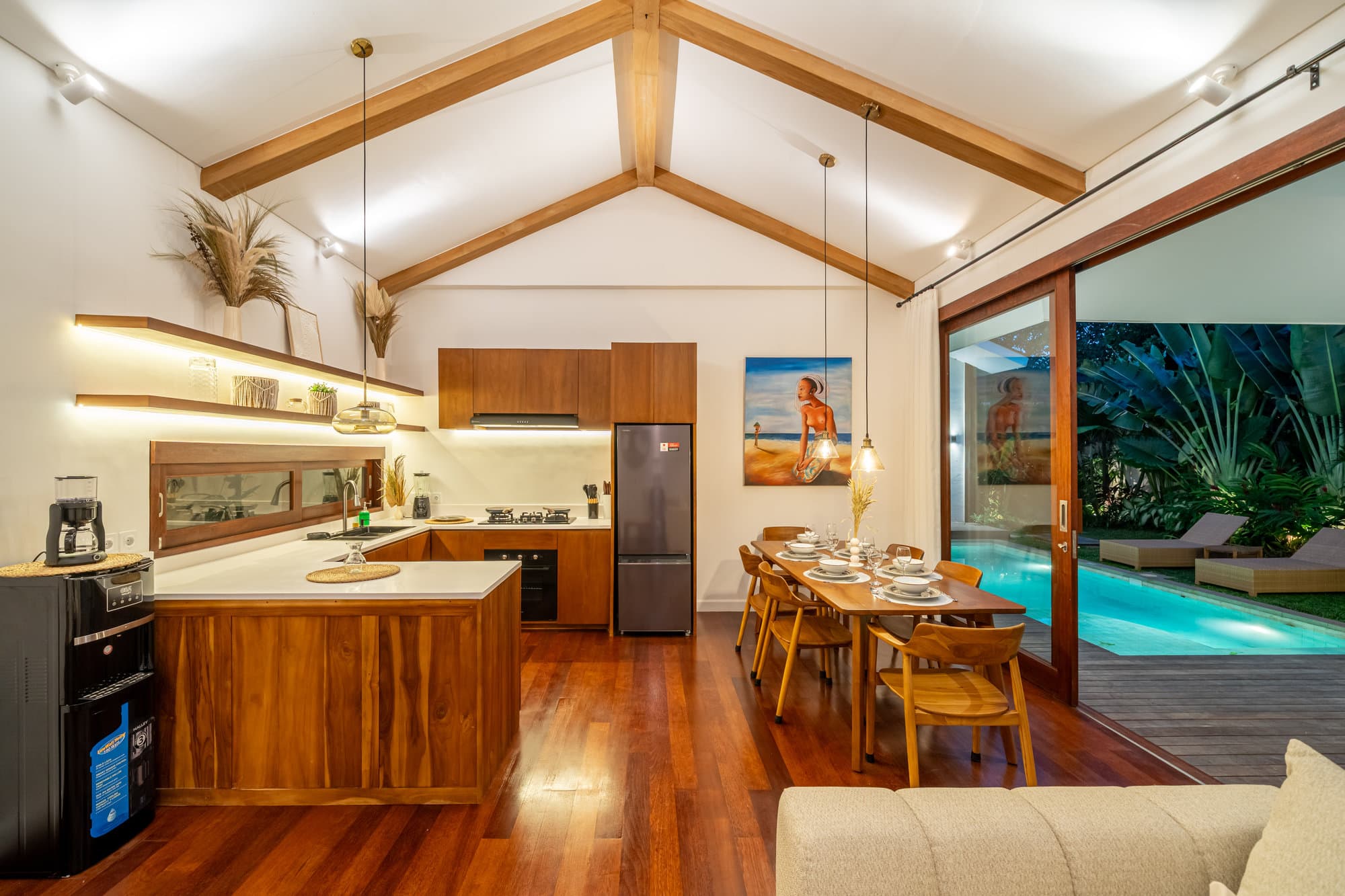 После того, как вы забронируете, вся вилла станет вашим личным оазисом. Насладитесь элегантностью уютной гостиной, шикарным и уютным пространством, предназначенным для отдыха и общения. Открытая кухня легко соединяется с гостиной, создавая пространство, идеальное для развлечений или неформальных обедов.