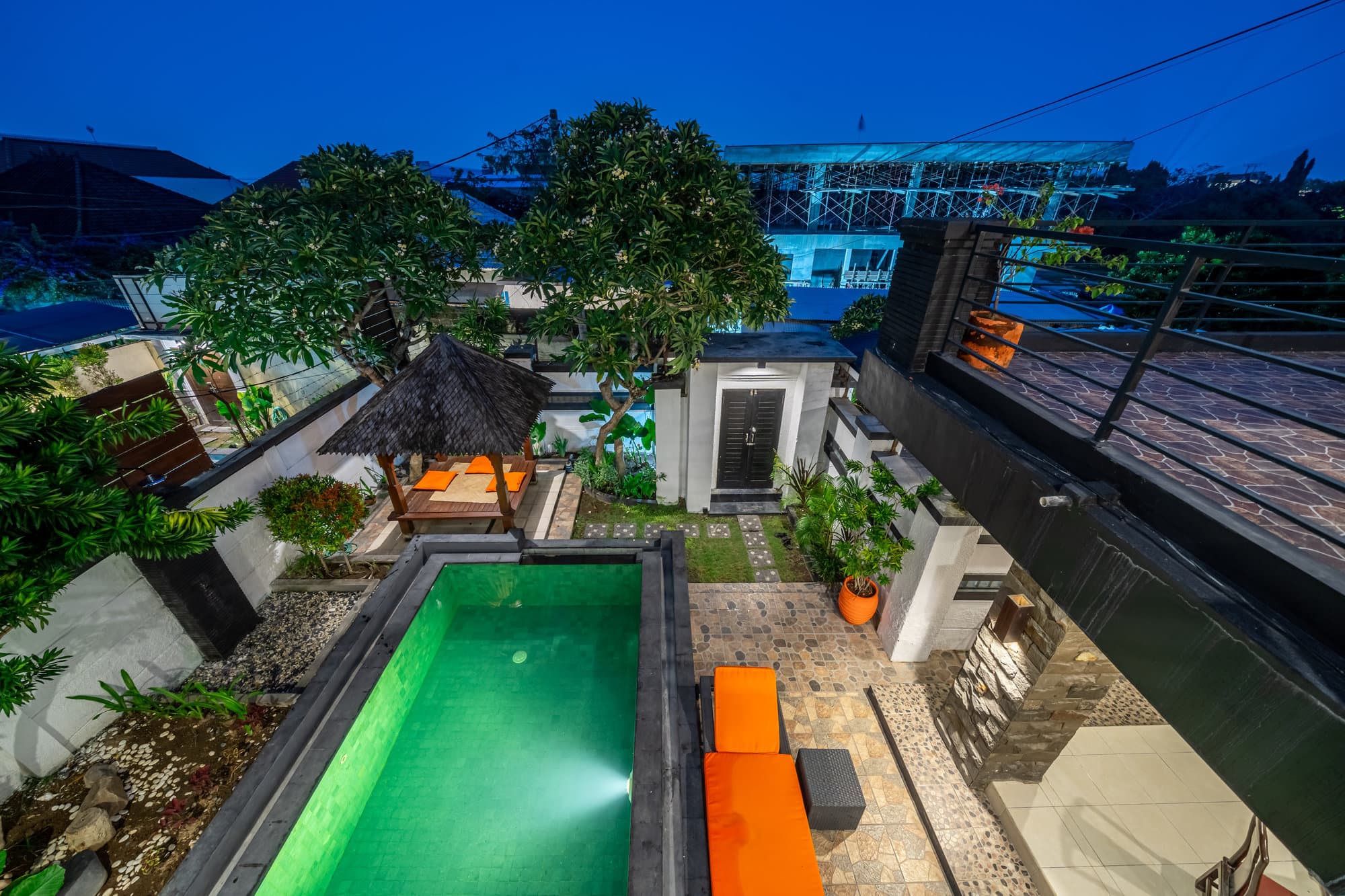 Терраса с шезлонгами: расслабьтесь и отдохните на шезлонгах с прекрасным видом на бассейн и пышный сад.